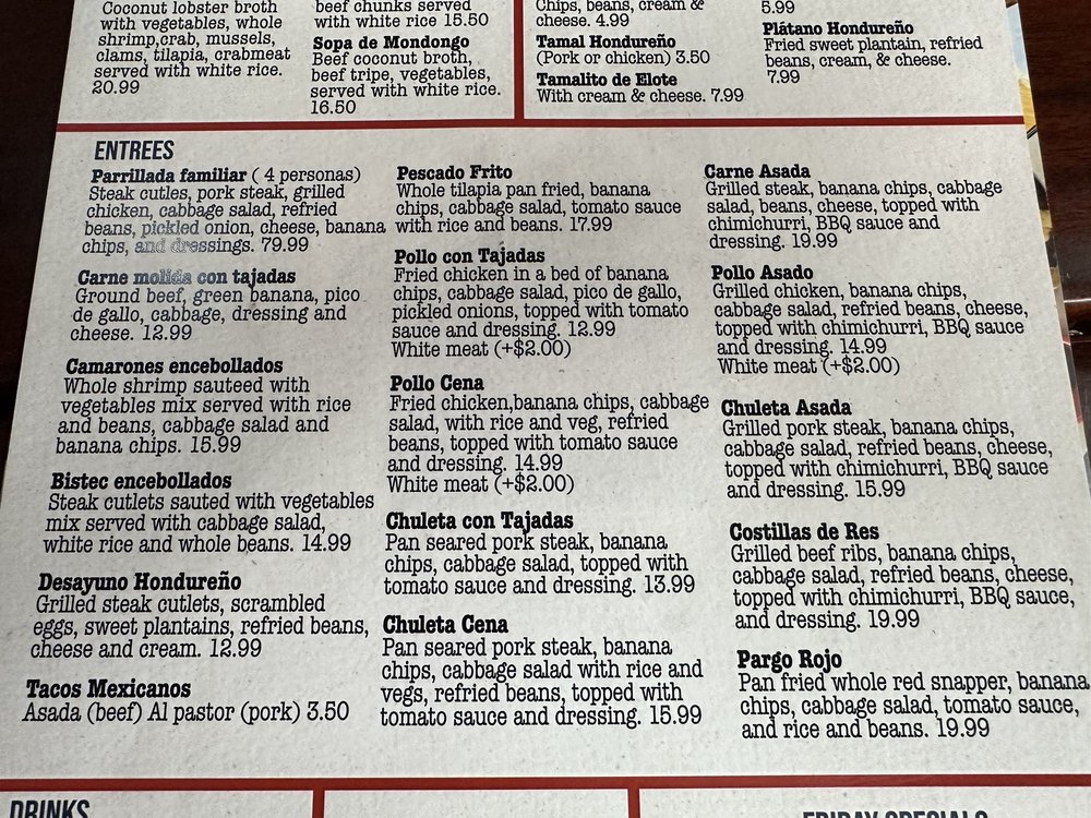 Honduran bbq mixed grilled, half chicken, steak cutlets, pork chops,cabbage salad, pickled onions, refried beans, honduran, cheese, and Honduran green banana chips, accompanied with our homemade sauces.